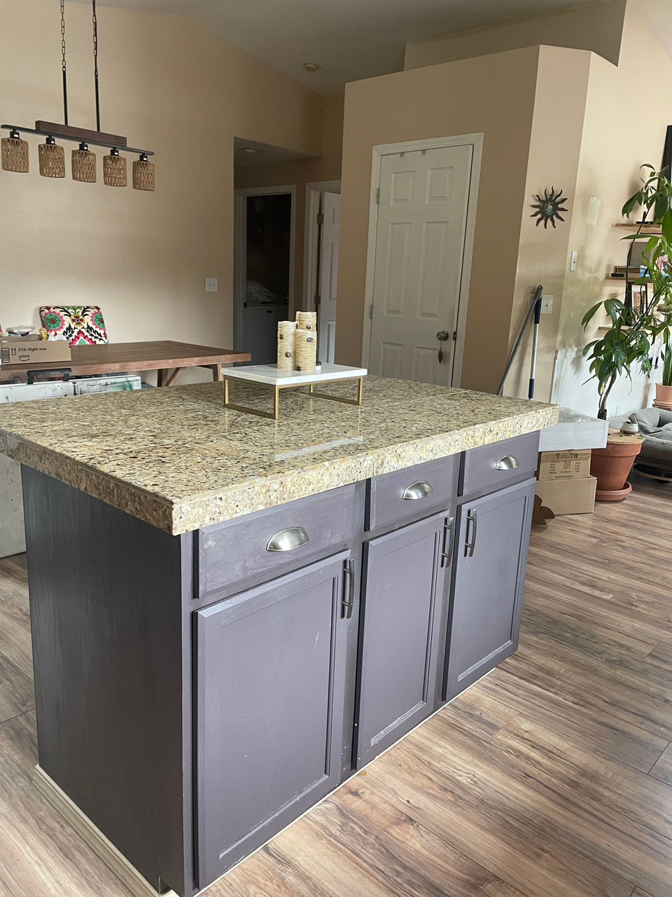 Was it purple or was it brown? Two toned cabinets needed to be updated, regardless! The client and I worked on finding the perfect color until she chose this one. A little cleaning, sanding, priming, painting and sealing along with golden hardware brought this kitchen up to speed. I loved working on this while she was out of town so she could come home to this great suprise!